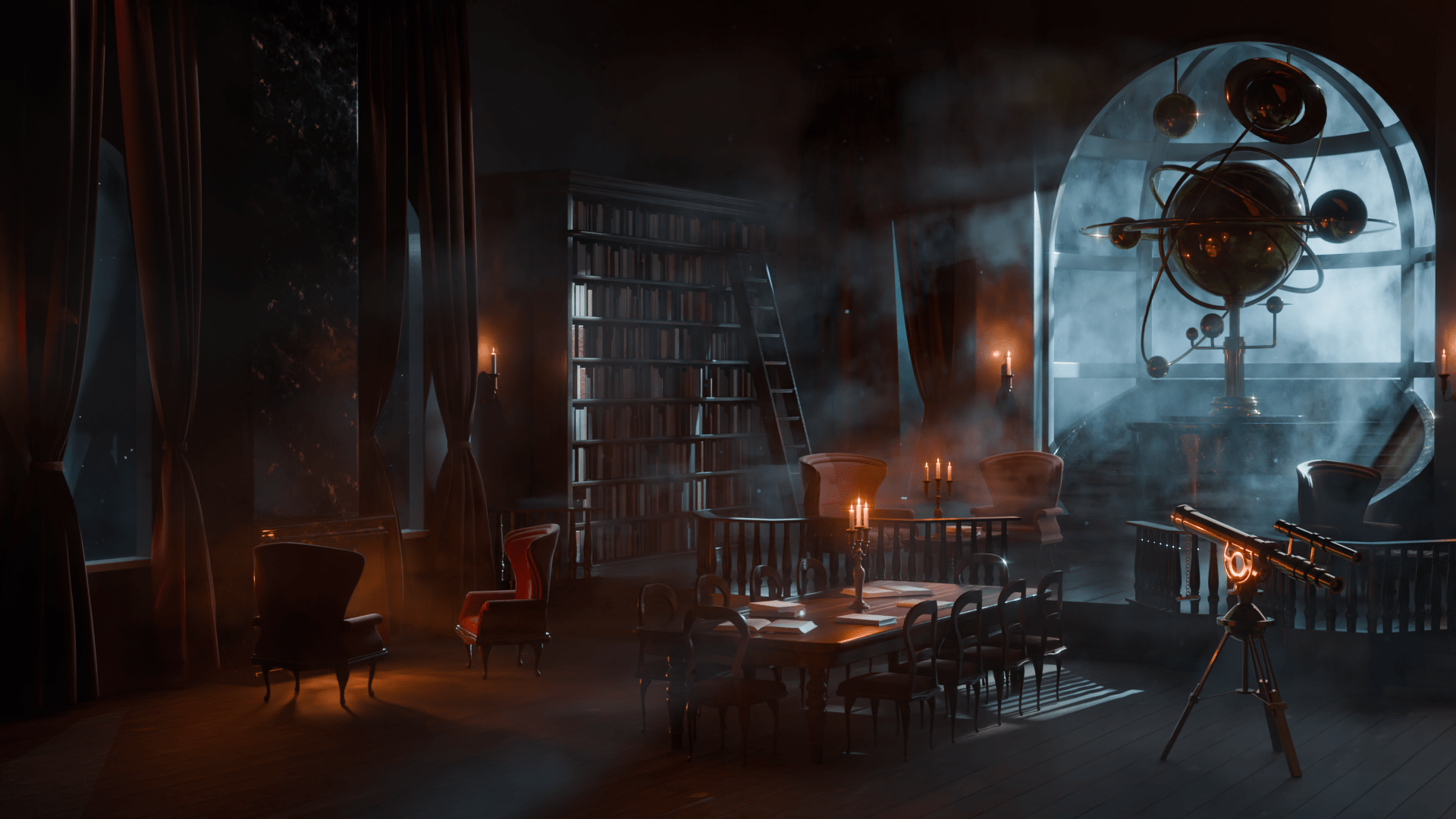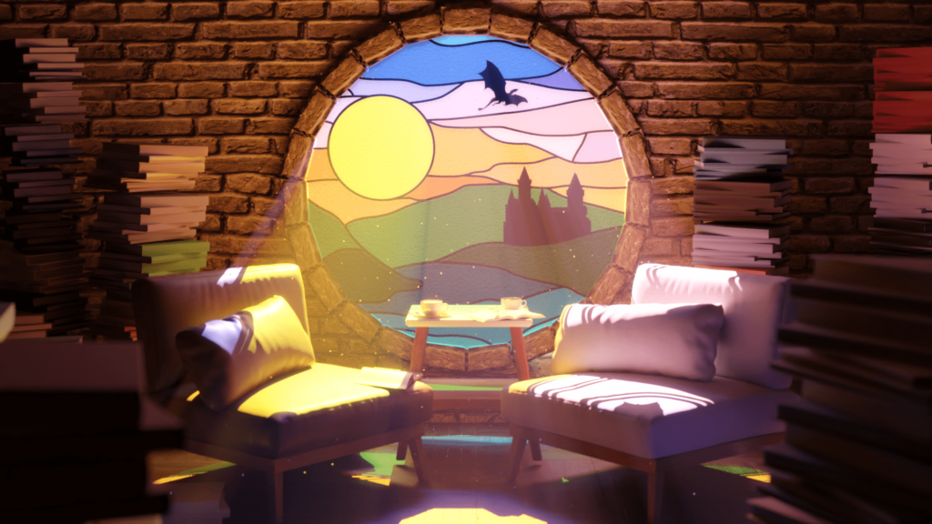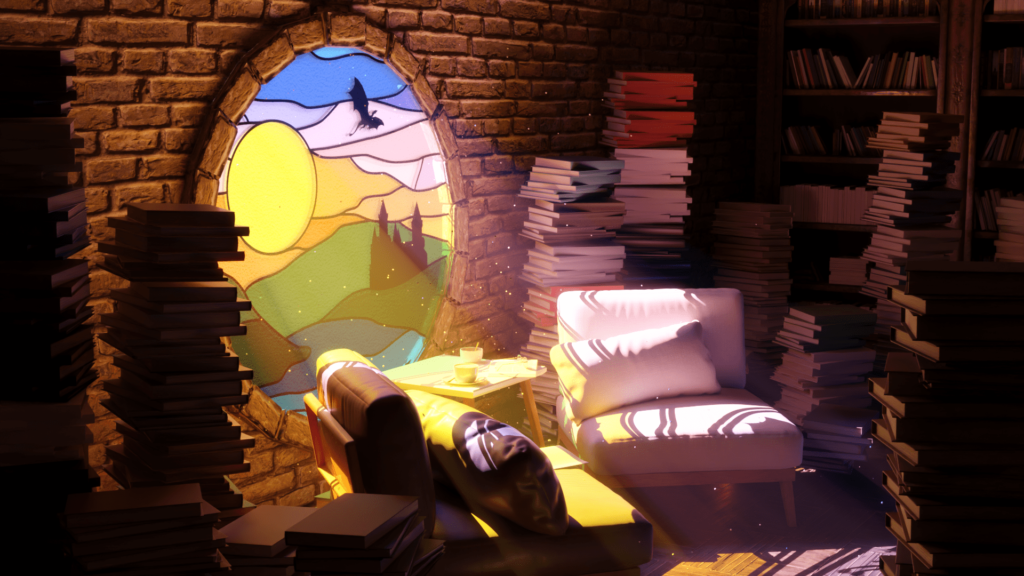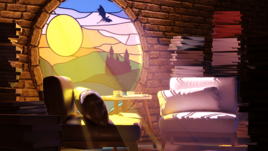 This was one of my own project. I wanted to create a cinematic scene by making god rays come out of the stained glass. It had to be warm and cozy, so i gave it a warmer light, with lots of pink, orange and purple.