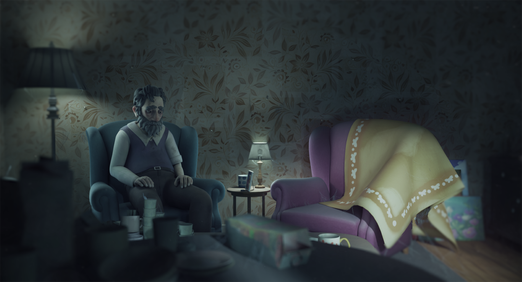 Arthur is a 70-year-old man who has lost his wife. Since her passing, he has been trapped in his grief and sorrow. He no longer leaves his house and has stopped truly living. His home has become a chaotic mess, with dirty plates and cutlery scattered everywhere. The energy to take care of himself has vanished. What was once a warm and vibrant home is now bleak and colorless.